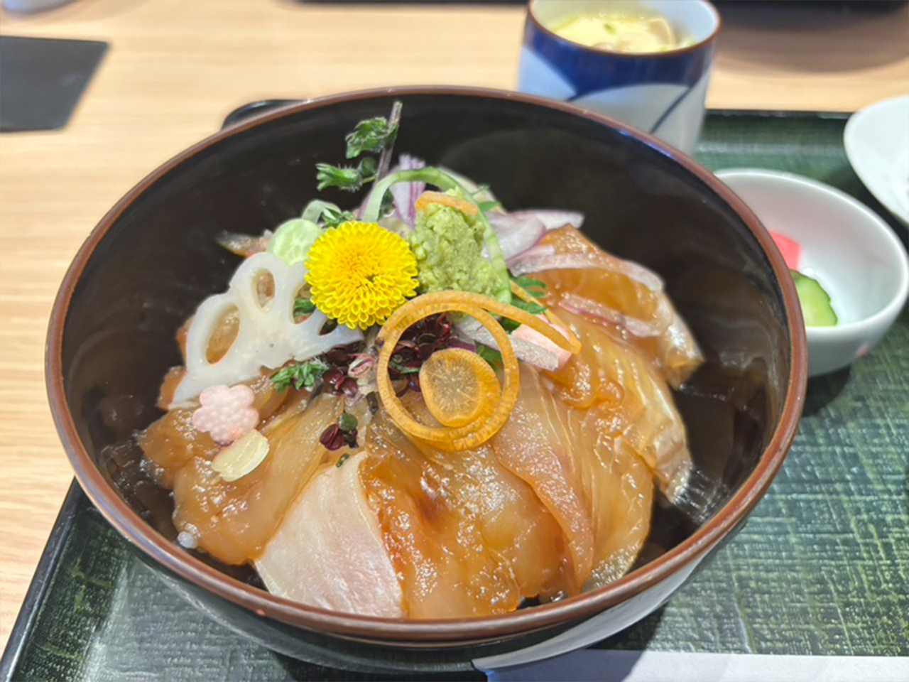 「平目の漬け丼」はというと醤油ベースのタレにしっかりと漬けられていて、1切れ1切れに味が浸み込んでいました。
