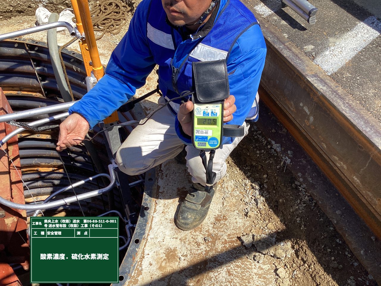 もちろん、酸素濃度と硫化水素の測定も欠かさず行います。測定しながら安全に作業を進めています。