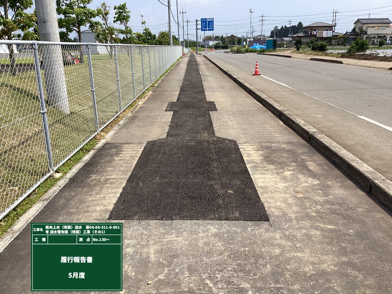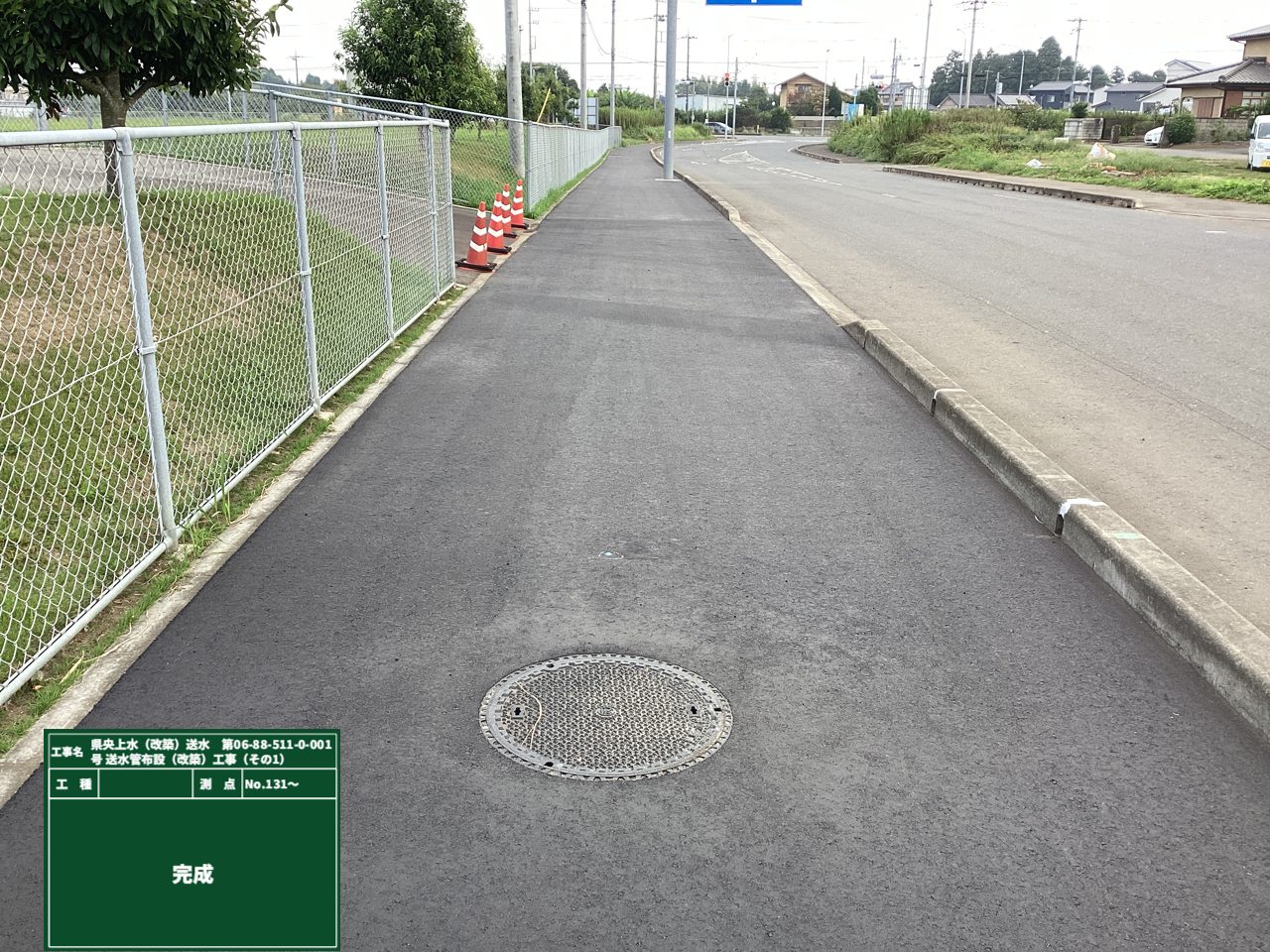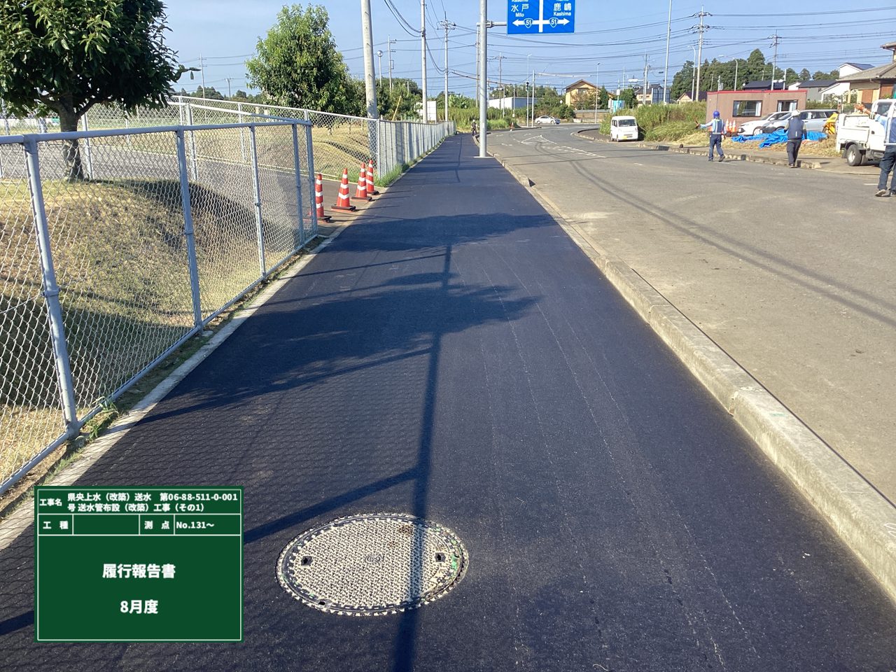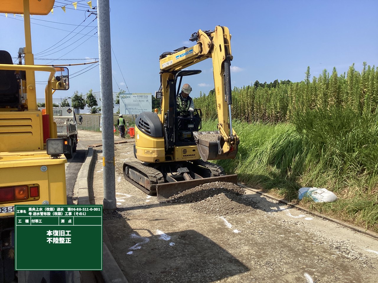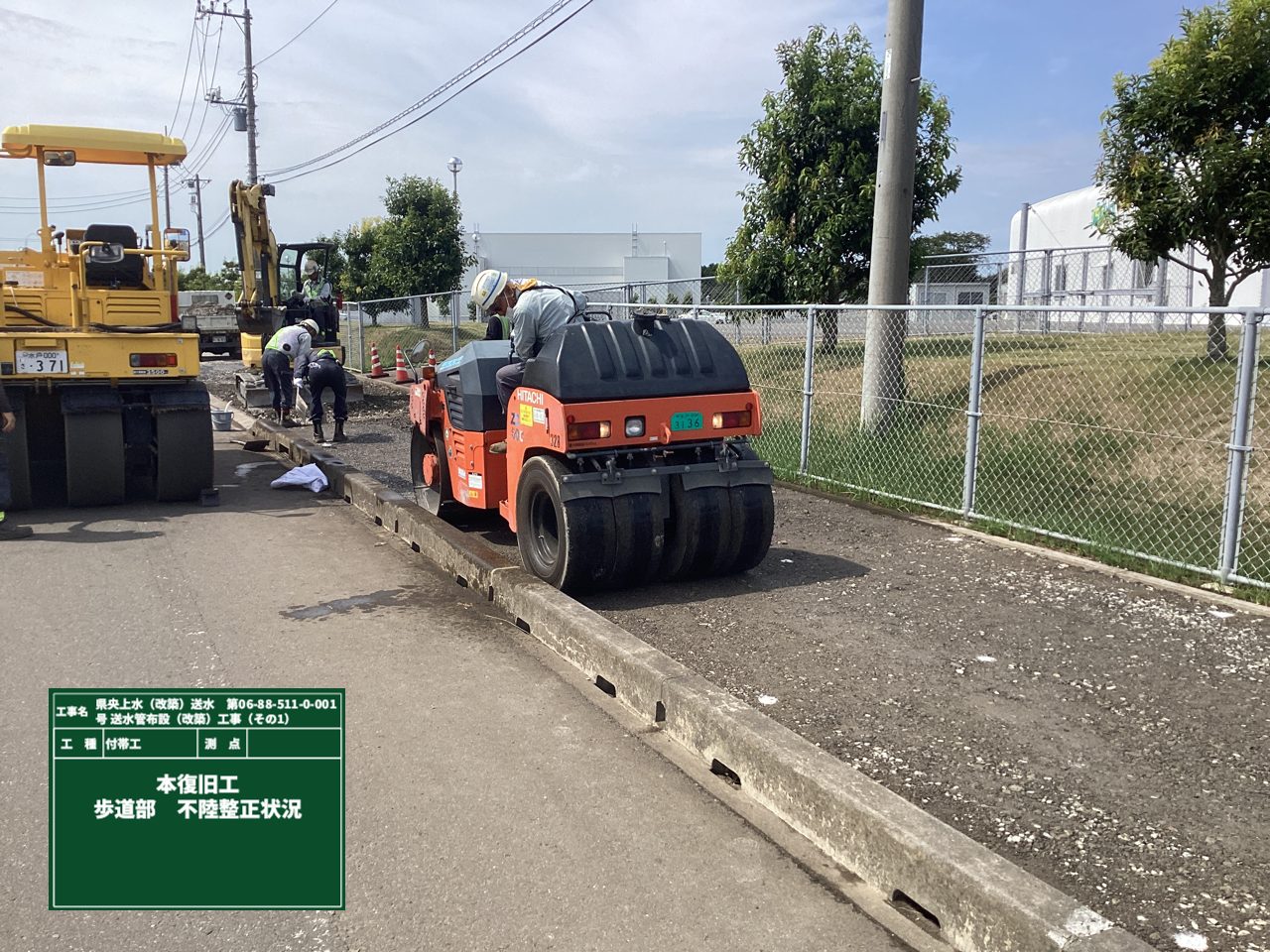送水管を布設するため、掘削→管布設→埋戻し→舗装復旧を繰り返しています。