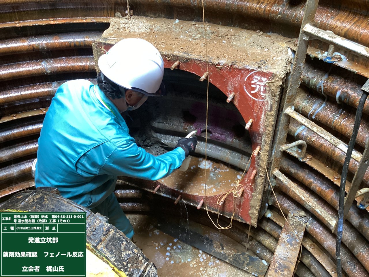 さて、発進立杭では、鏡切りが完了した確認と、薬液注入の効果をみるためのテストを行っています。