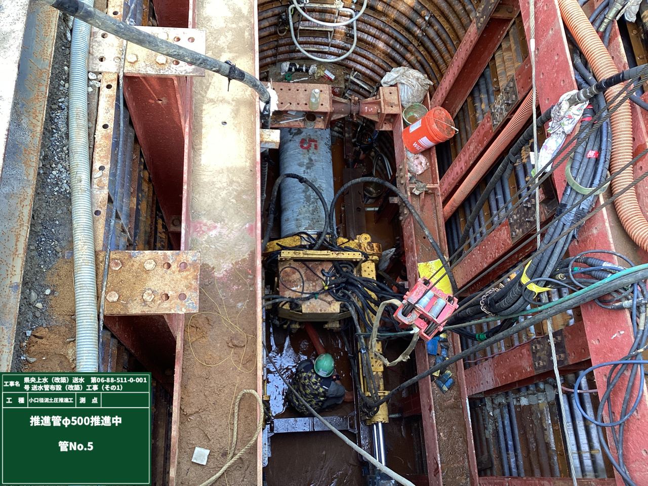 これを「推進工法」と言って、発進~到着まで地下から推進管を押し込んで管を埋設していきます。