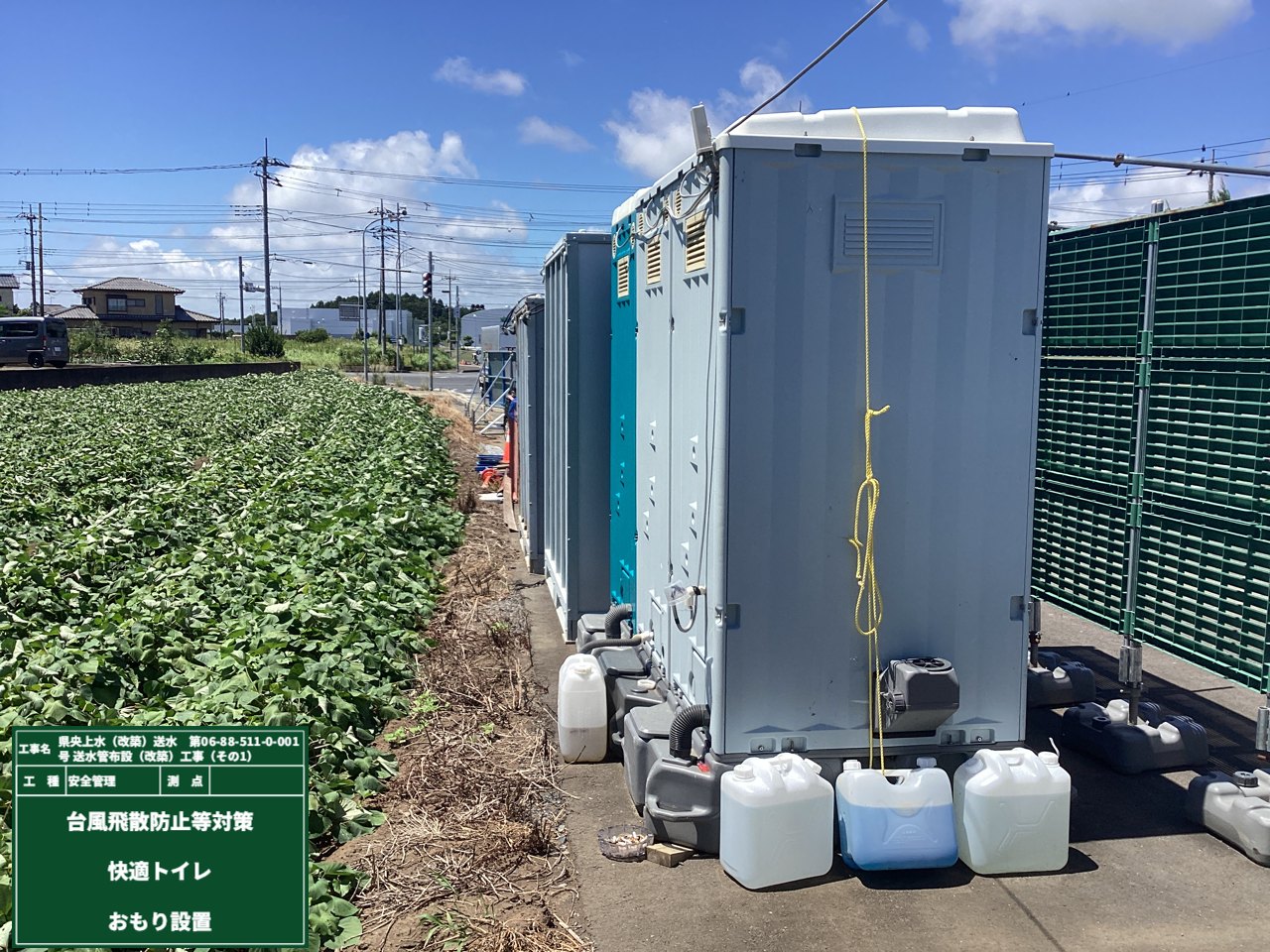 「台風が来るぞー‼」とのことで、現場のあらゆるものを飛散防止対策しました。