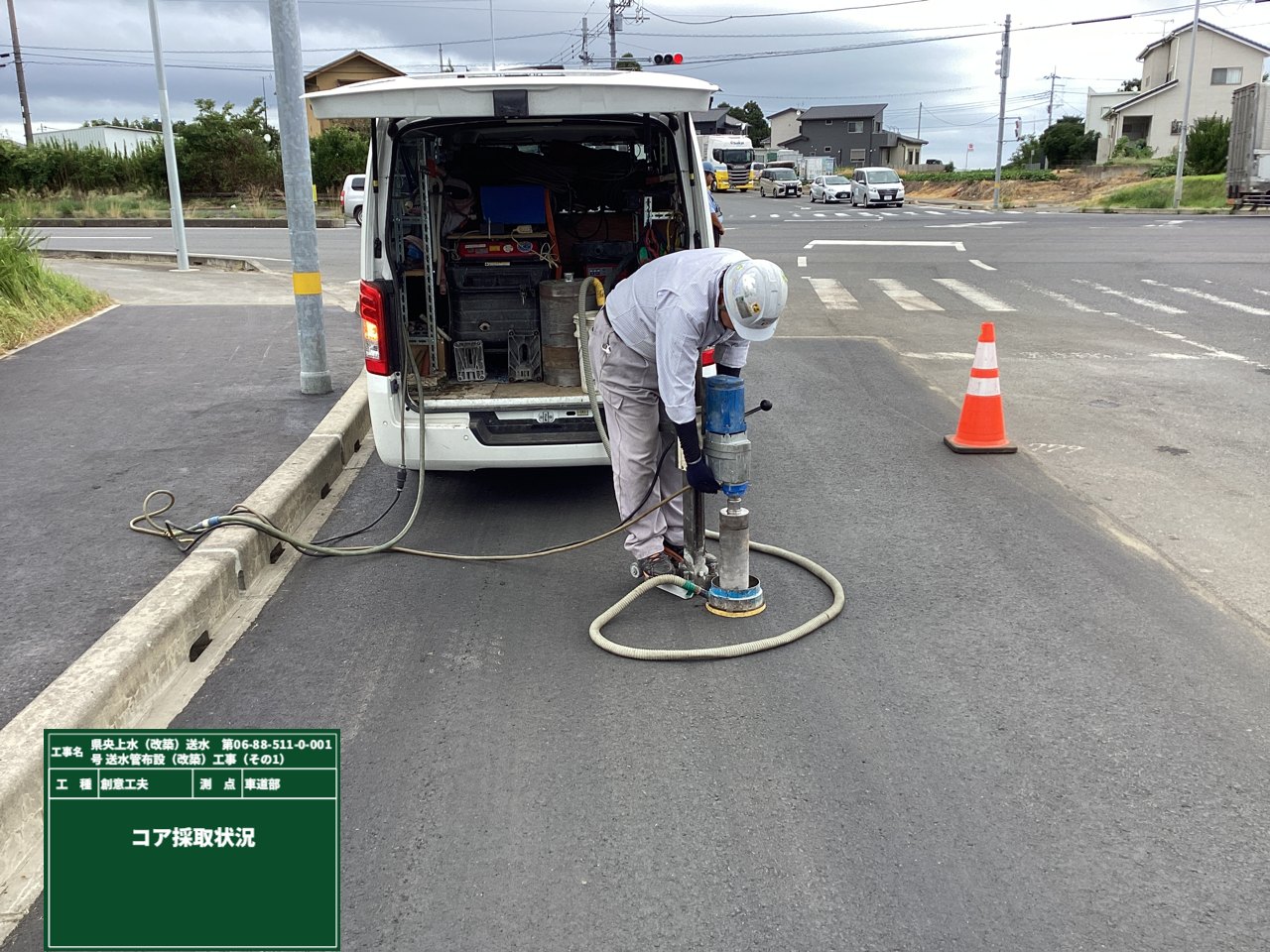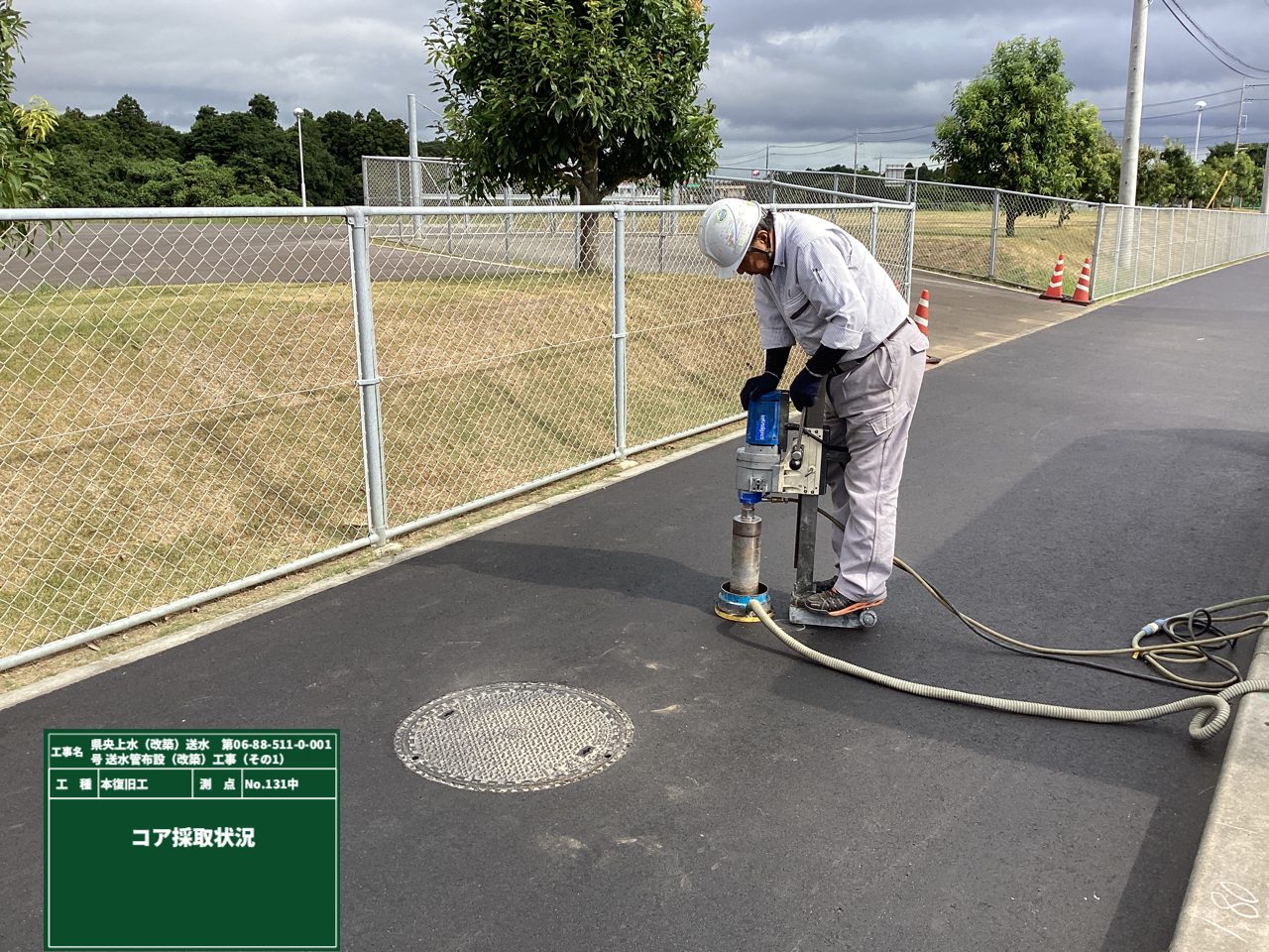 コアカッターという専用の機械で、アスファルト舗装を円柱状にくり抜き、厚さ・密度・締固め度などを確認していきます。